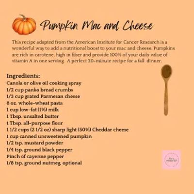 INSTRUCTIONS: Preheat oven to 375. Coat a 6 cup baking dish with cooking spray. In a seperate bowl, mix together bread crumbs and Parmesan cheese. Set aside. In a large pot, boil 4 quarts of water. Add pasta and cook for 10 minutes, drain. While pasta cooks, heat milk in microwave until it steams, set aside. In a large sauce pan, melt butter over medium heat. Whisk in flour and cook for 1 minute, whisking slowly. Remove from heat, gradually add milk, continue to whisk. Return pot to medium heat and simmer sauce until it thickens to consistency of stirred yogurt, about 3 minutes. Add Cheddar cheese, pumpkin, mustard, black and cayenne pepper and nutmeg. Stir until cheese melts completely. Mix in cooked pasta. Spread mixture into prepared baking dish. Sprinkle bread crumbs and Parmesan over top. Bak 15-20 minutes or until breadcrumbs are crips. Serve immediately. Makes 6 servings. 260 cal, 6 g fat, 38 g carbs, 14 g protine, 6 g fiber, 230m sodium, 5 g sugar.